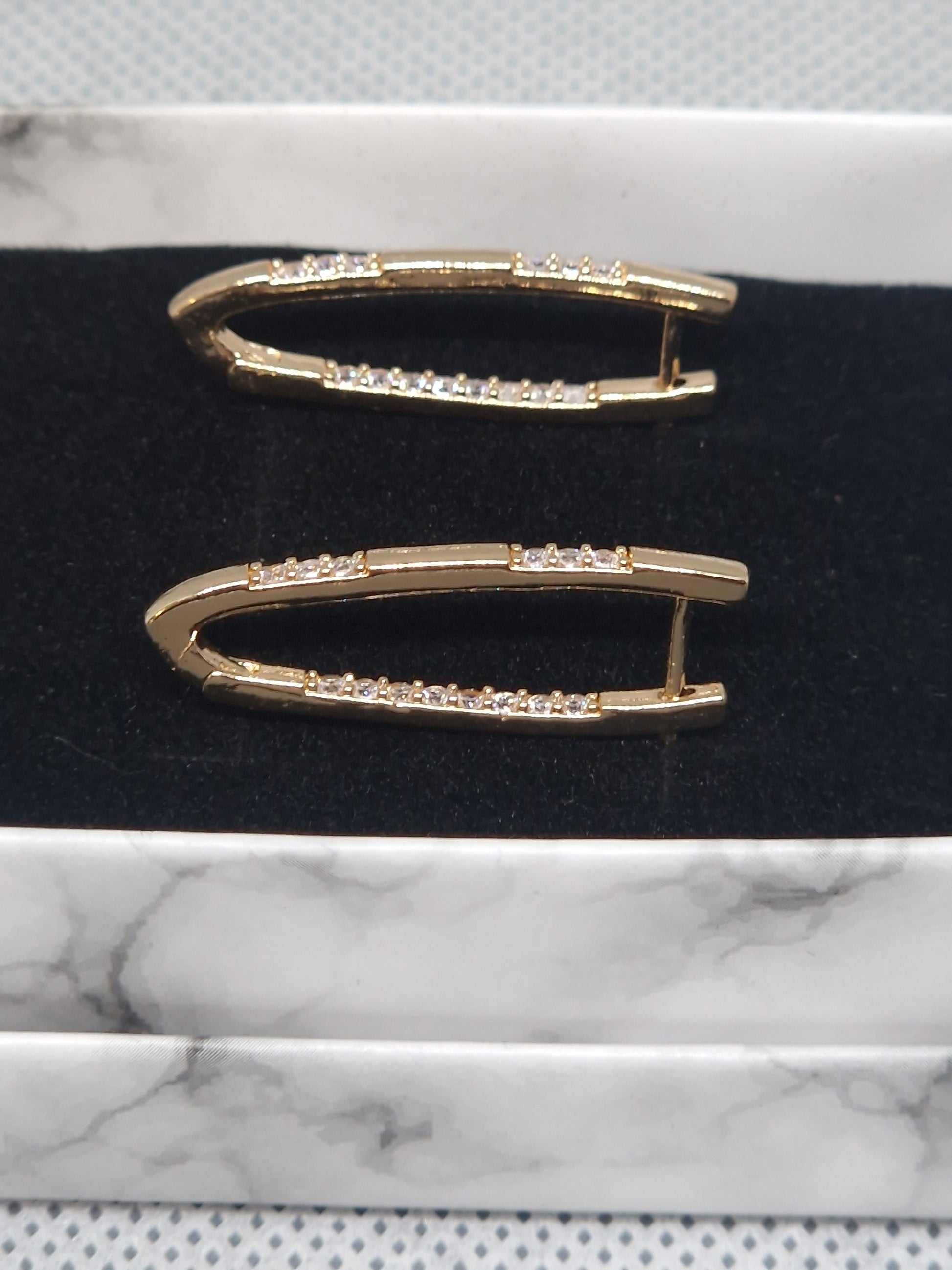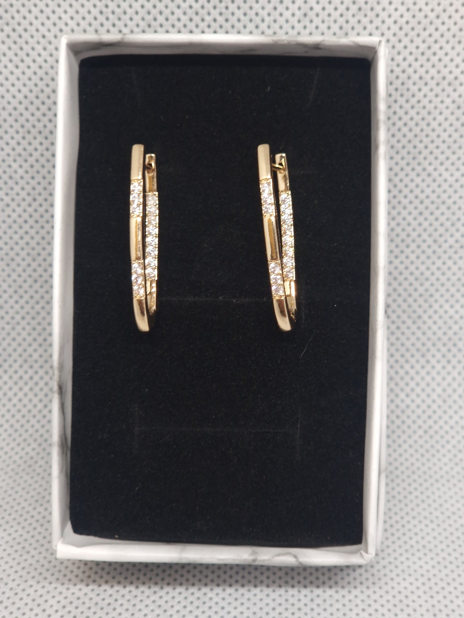 Designen är en elegant, rektangulär båge i varm guldfärg, prydd med två parallella rader av gnistrande, infattade kubisk zirkonia. De har en smidig och säker snäpplåsning som sitter bekvämt hela dagen.