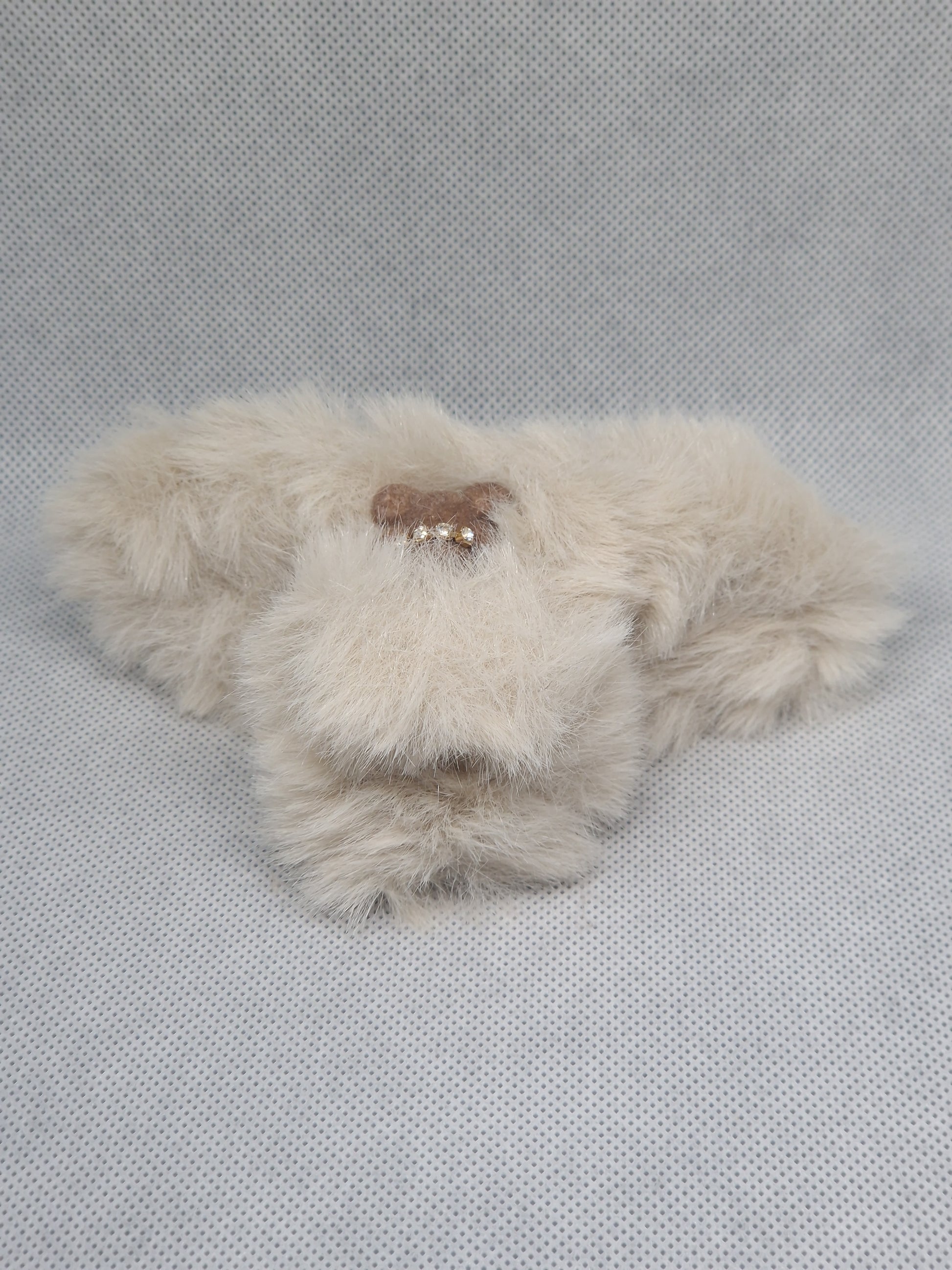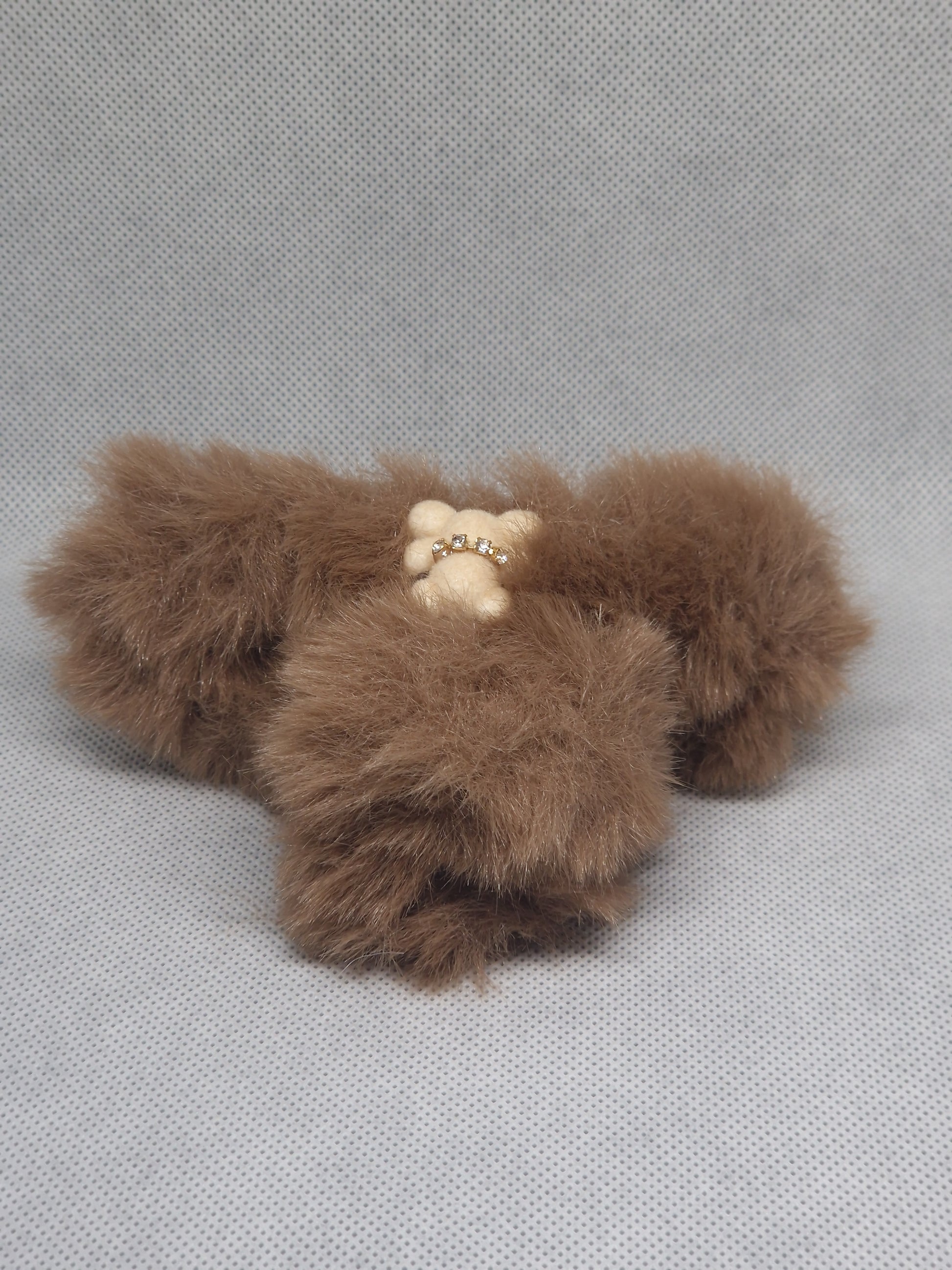 Klämman är hela 11 cm lång och täckt av ett mjukt, fuskpäls-material i en vacker, neutral gråbrun ton. Den lilla björnen är prydd med diskreta strass-detaljer som fångar ljuset.