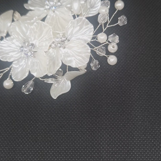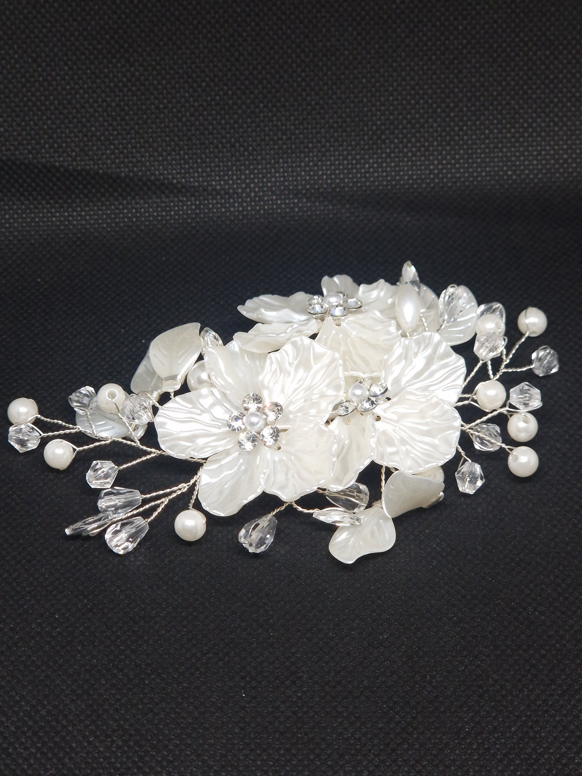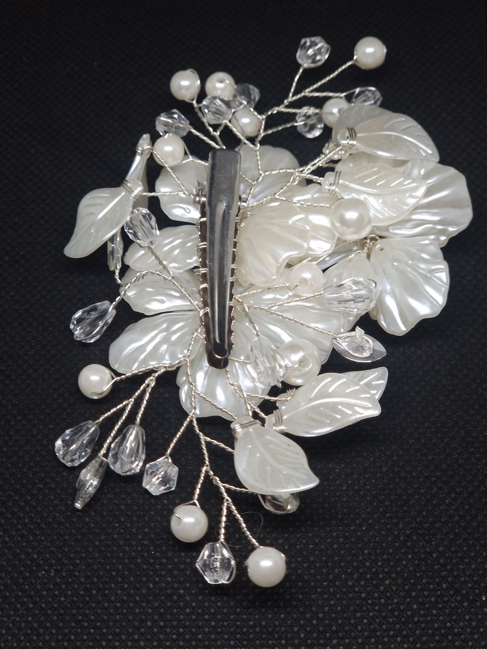 Klämman består av en blomsterkomposition där pärlemorvita kronblad möter gnistrande kristaller. De stora, glansiga blommorna är accentuerade med silverfärgade trådar smyckade med vita pärlor och droppformade, klara kristaller som reflekterar ljuset som nytillkommen snö.