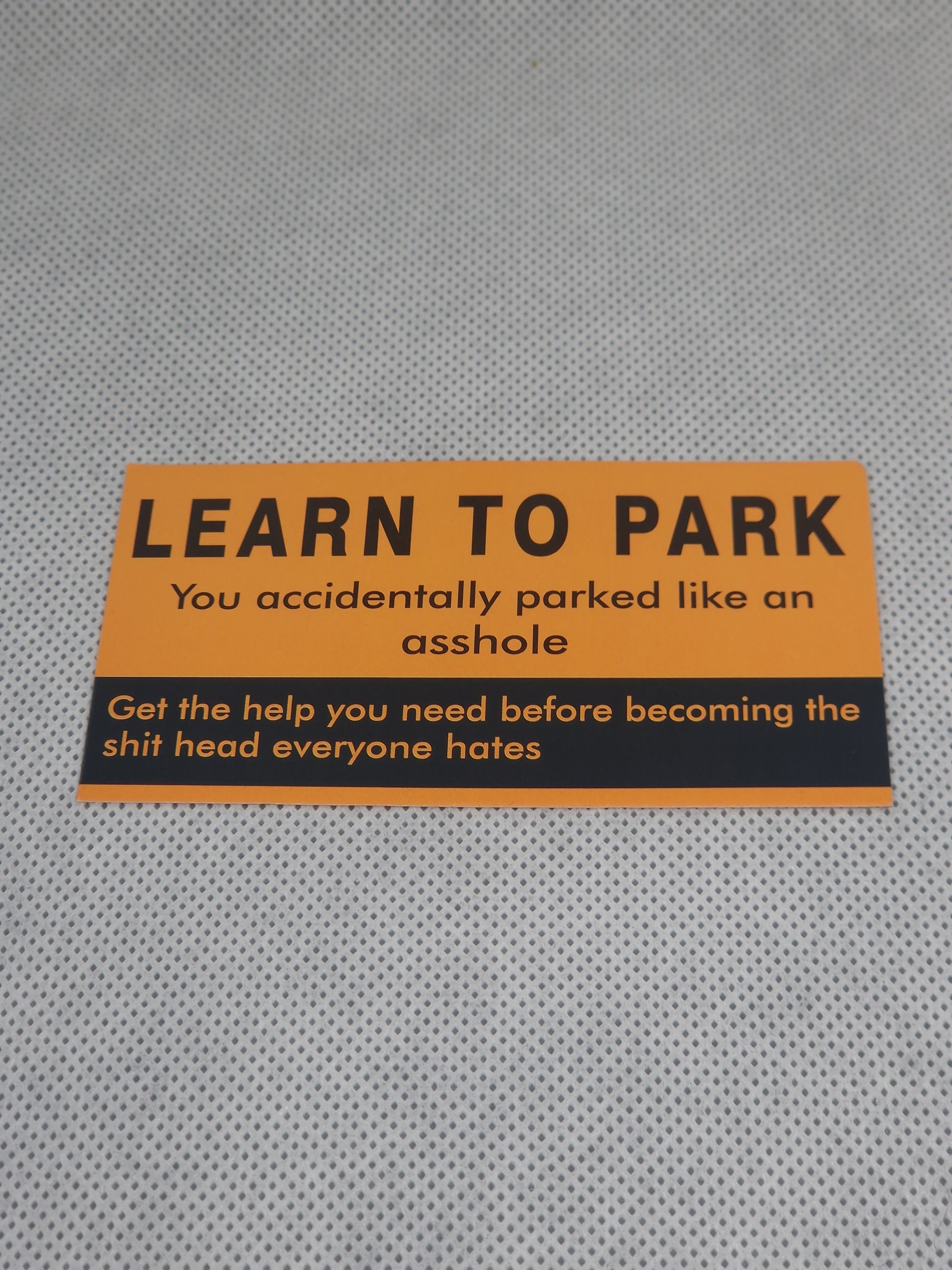 Det hĂ€r âLearn to Parkâ-kortet Ă€r den ultimata lösningen för dig som inte orkar fler sneda, dubbelparkerade eller totalt obegripliga bilplaceringar. LĂ€mna kortet under vindrutetorkaren och lĂ„t det tala för sig sjĂ€lv â tydligt, rakt och med ett sprĂ„k som Ă€ven den vĂ€rsta parkeraren förstĂ„r.