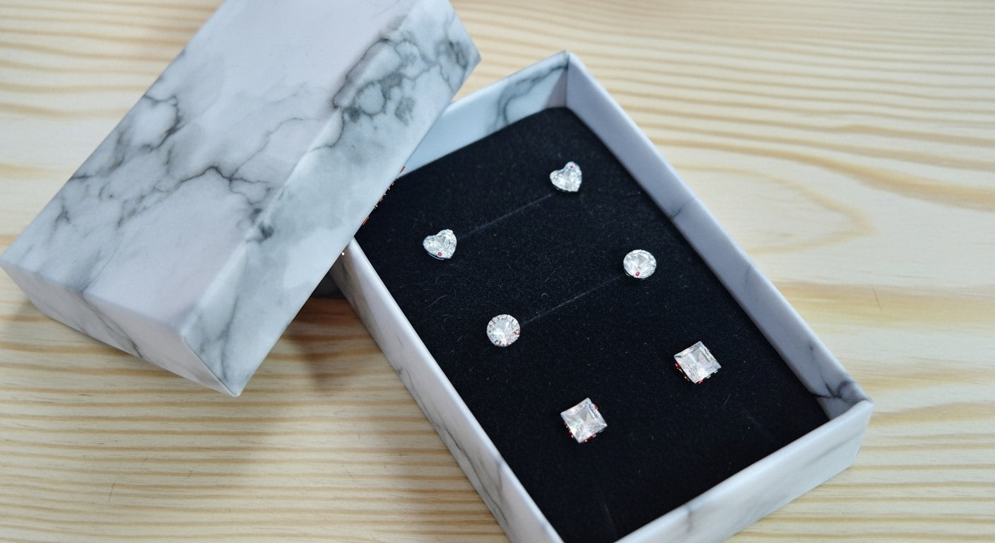 Setet innehåller ett par örhängen: klassiska runda, romantiska hjärtan eller stilfulla fyrkantiga slipningar. Tillverkade i högkvalitativt silver och infattade med gnistrande stenar som fångar ljuset på ett förtrollande sätt.